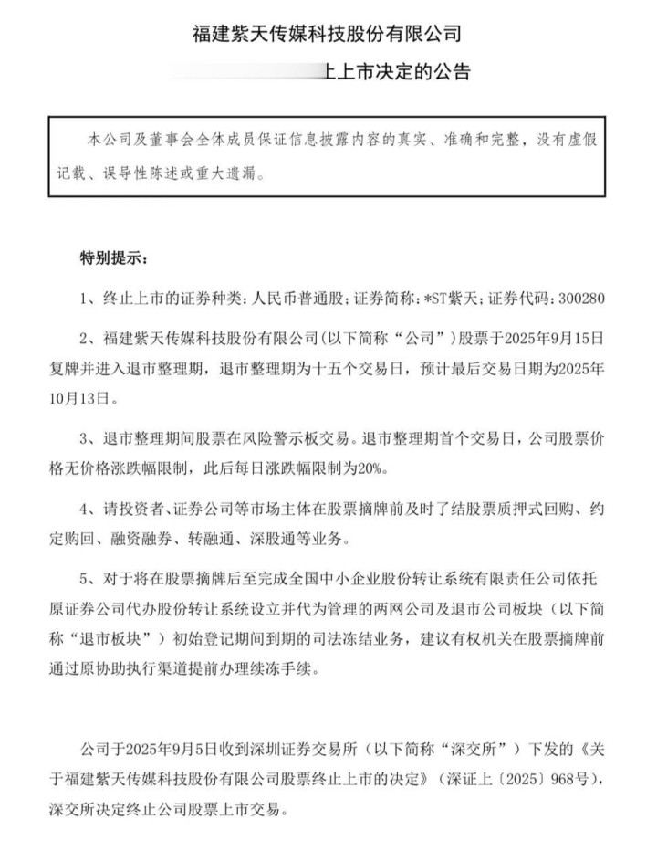 *ST紫天发布的公告显示,公司股票将于9月15日复牌并进入退市整理期,退市整理期的交易期限为15个交易日,退市整理期期满后深交所将对公司股票进行摘牌。