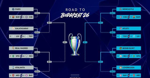1/8决赛完整对阵情况阿森纳/拜仁vs勒沃库森/亚特兰大