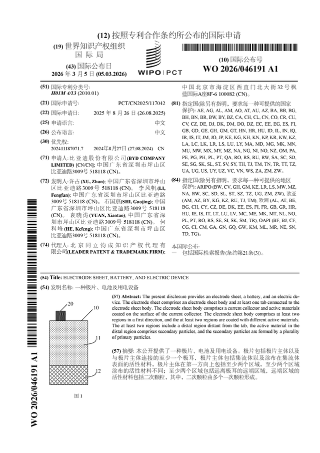 证券之星消息,根据企查查数据显示比亚迪(002594)公布了一项国际专利申请,专利名为“一种极片、电池及用电设备”,专利申请号为PCT/CN2025/117042,国际公布日为2026年3月5日。