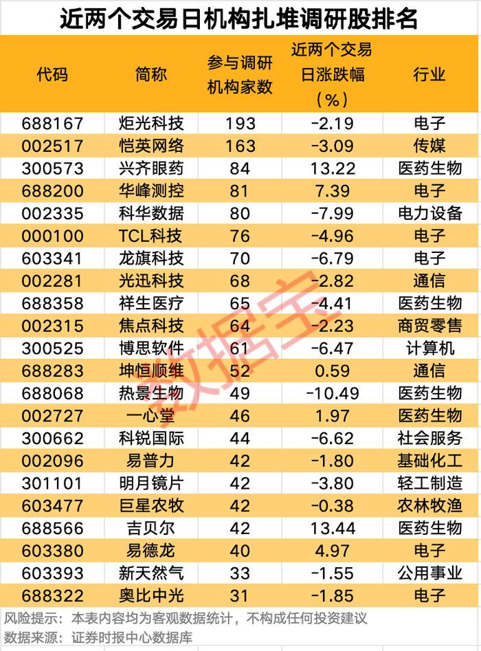 近两个交易日(9月1日至9月2日)共有108家公司公告机构调研记录。其中,12家公司获超50家机构扎堆调研,炬光科技参与调研机构家数最多,达193家,其次是恺英网络,参与调研机构家数为163家。