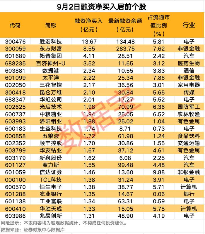 具体到个股,9月2日获融资净买入千万元以上的有562股,其中37股融资净买入额均超1亿元。胜宏科技融资净买入额居首,当日净买入13.67亿元,其次是东方财富、拓普集团,融资净买入金额分别为8.55亿元、4.11亿元,融资净买入金额居前的还有百济神州-U、数据港、太平洋等。
