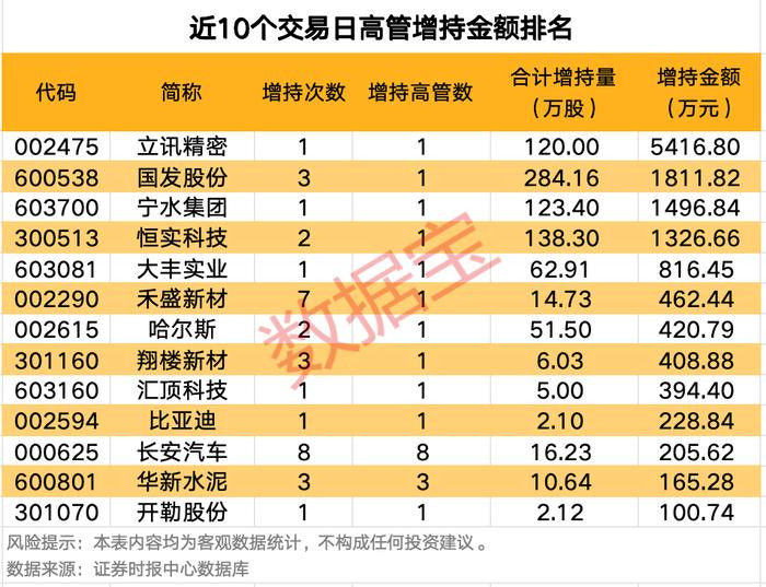 从增持金额来看,近10个交易日增持金额最多的是立讯精密,累计增持120万股,增持金额合计5416.8万元;其次是国发股份,增持量为284.16万股,增持金额1811.82万元;宁水集团近10个交易日累计获高管增持1496.84万元,增持金额位居第三。